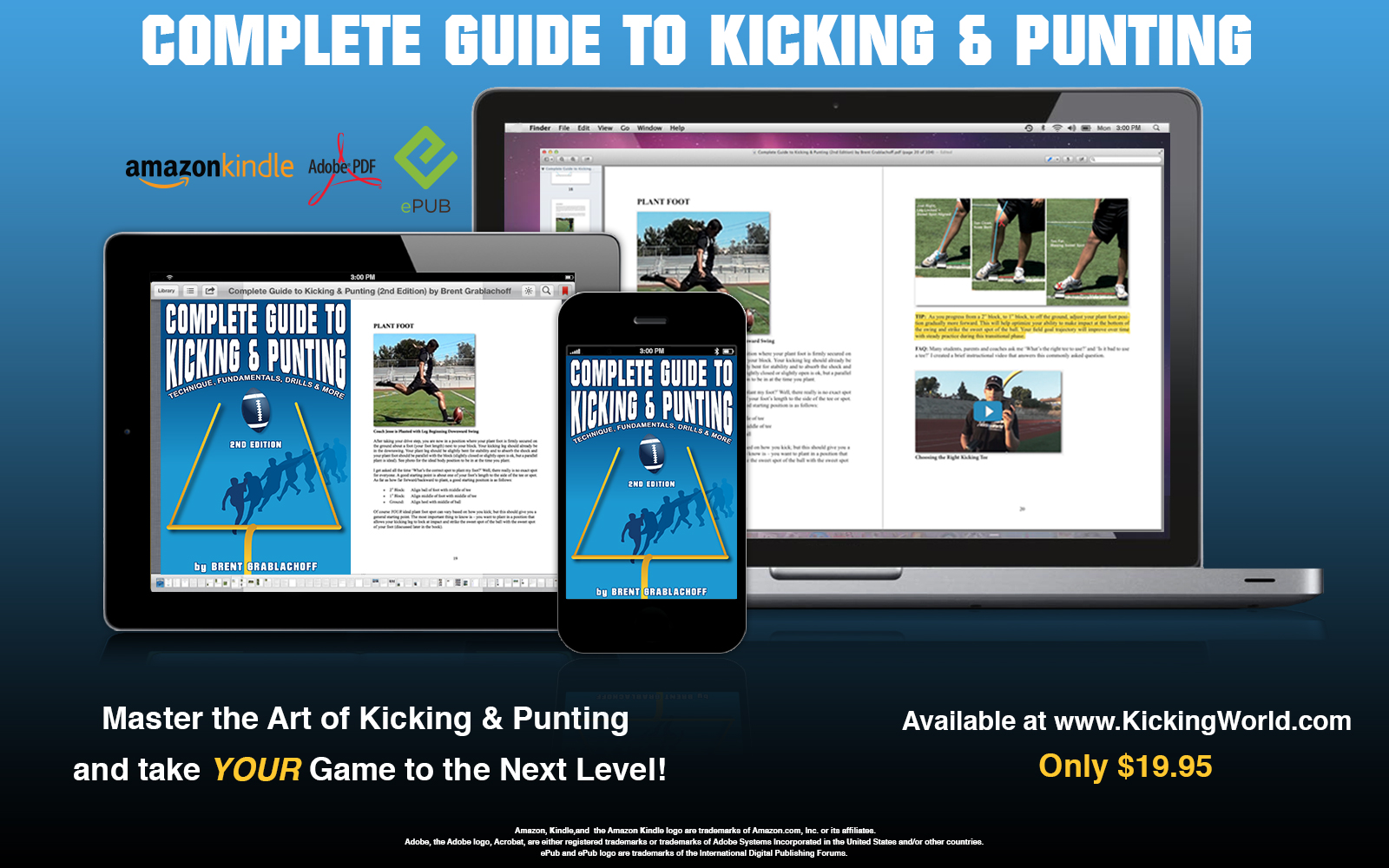 The Paperback kicking book is shipped to your door and the electronic book is downloadable instantly and one purchase of the eBook version gets you 3 file types: PDF, ePub and .MOBI. The Complete Guide to Kicking & Punting eBook works on virtually all Tablets and eReaders including iPad, Kindle, Nook, Google Nexus, etc. and even works beautifully on smartphones with the Kindle Reader app or basic .PDF viewer! It’s the most versatile kicking book written to date and is loaded with information for kickers and punters pertaining to field goal kicking, punting, kickoffs and onside kicks.